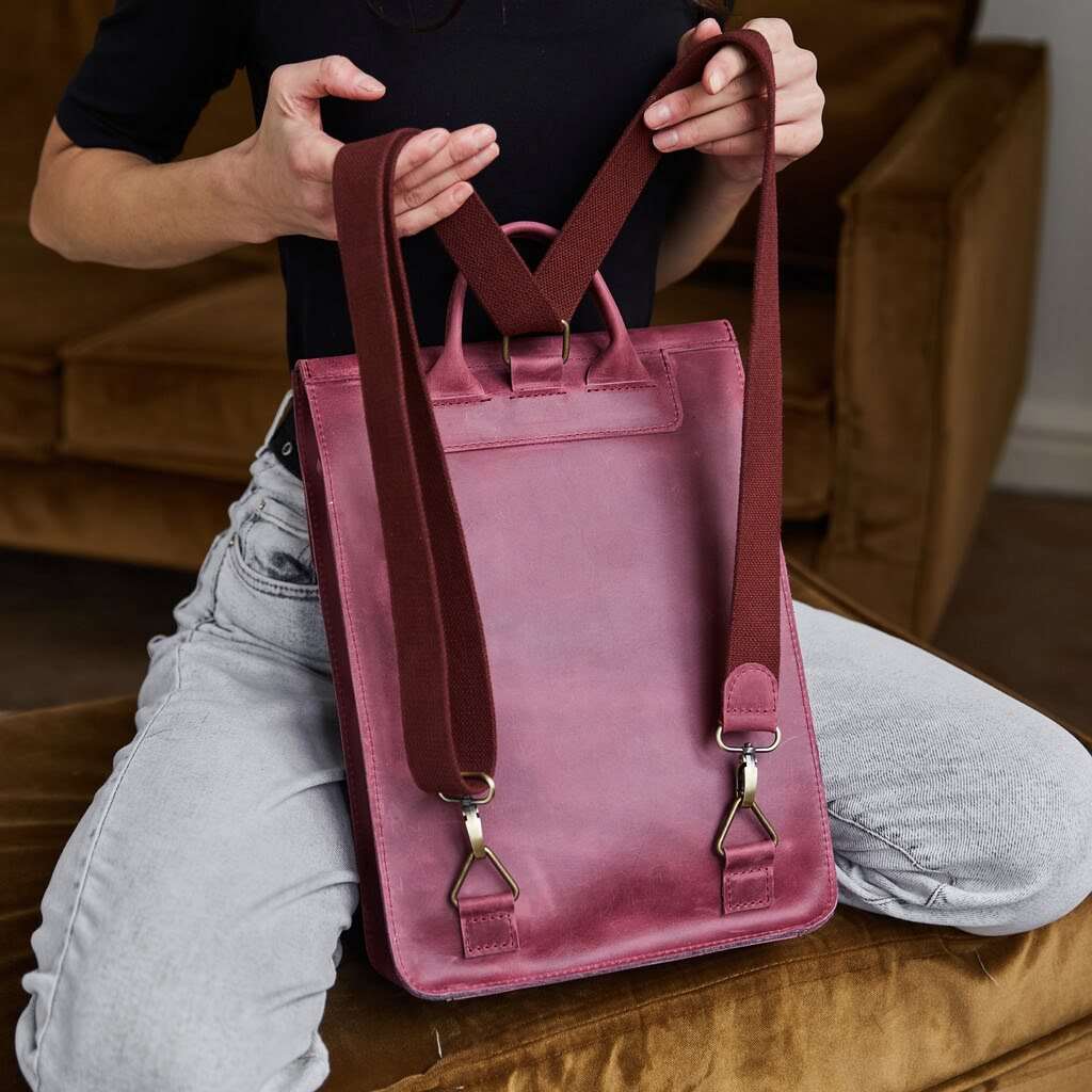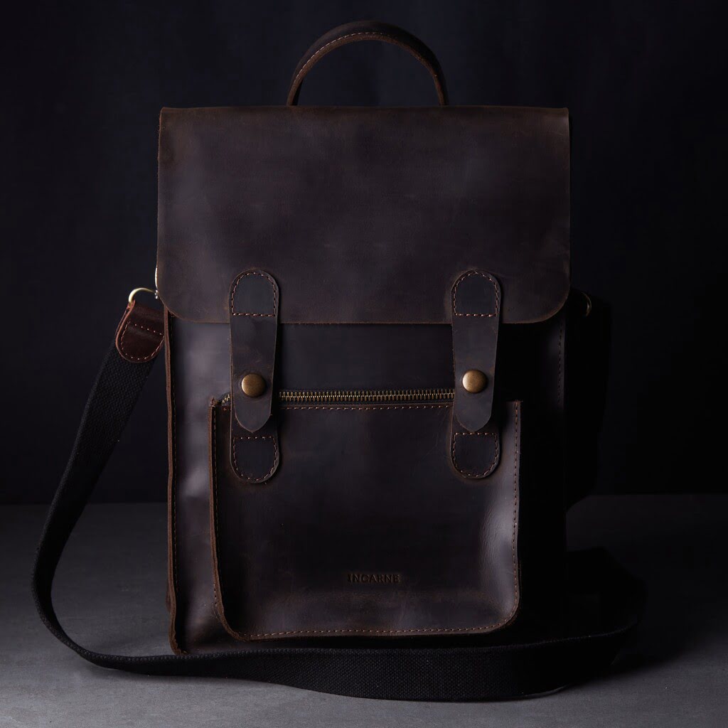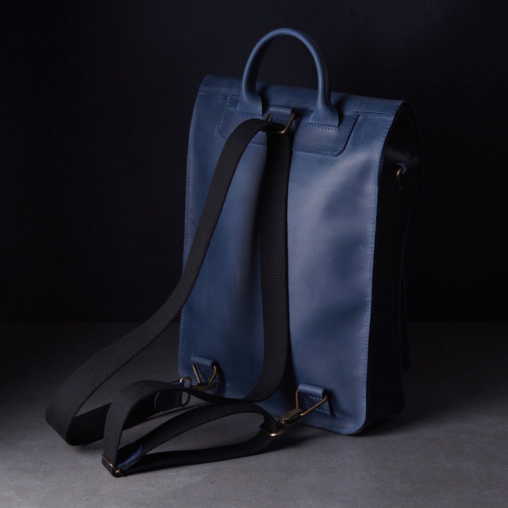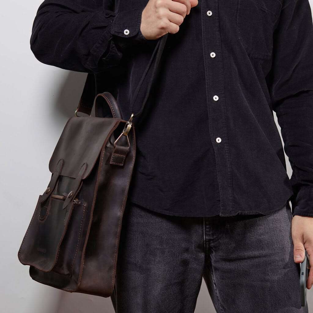 Brit is a convertible backpack briefcase: you can carry it as a cross-body bag or a rucksack. The bag is closed with a zipper, and the top opens with metal buttons that have two different positions.