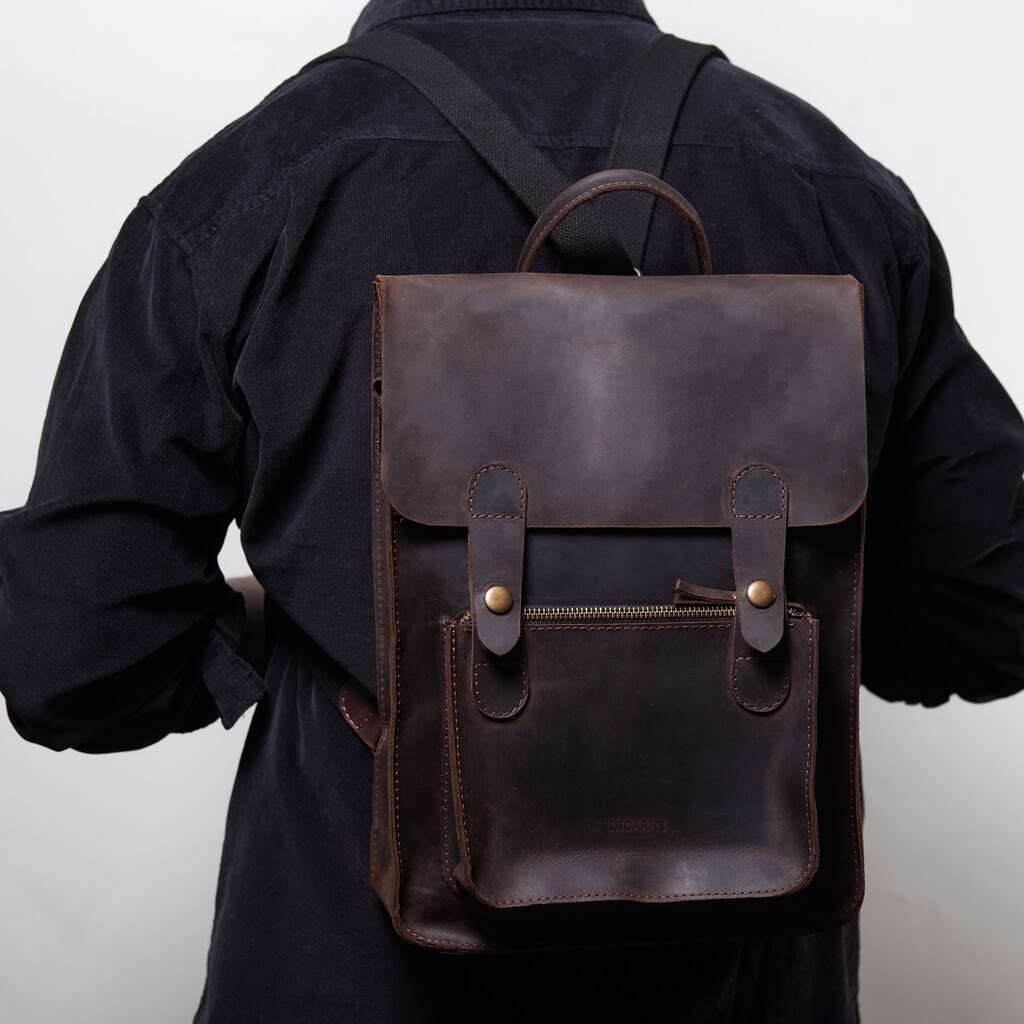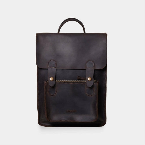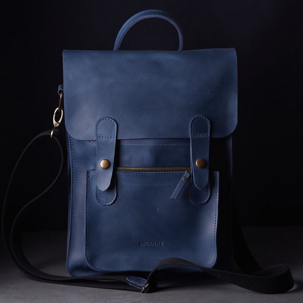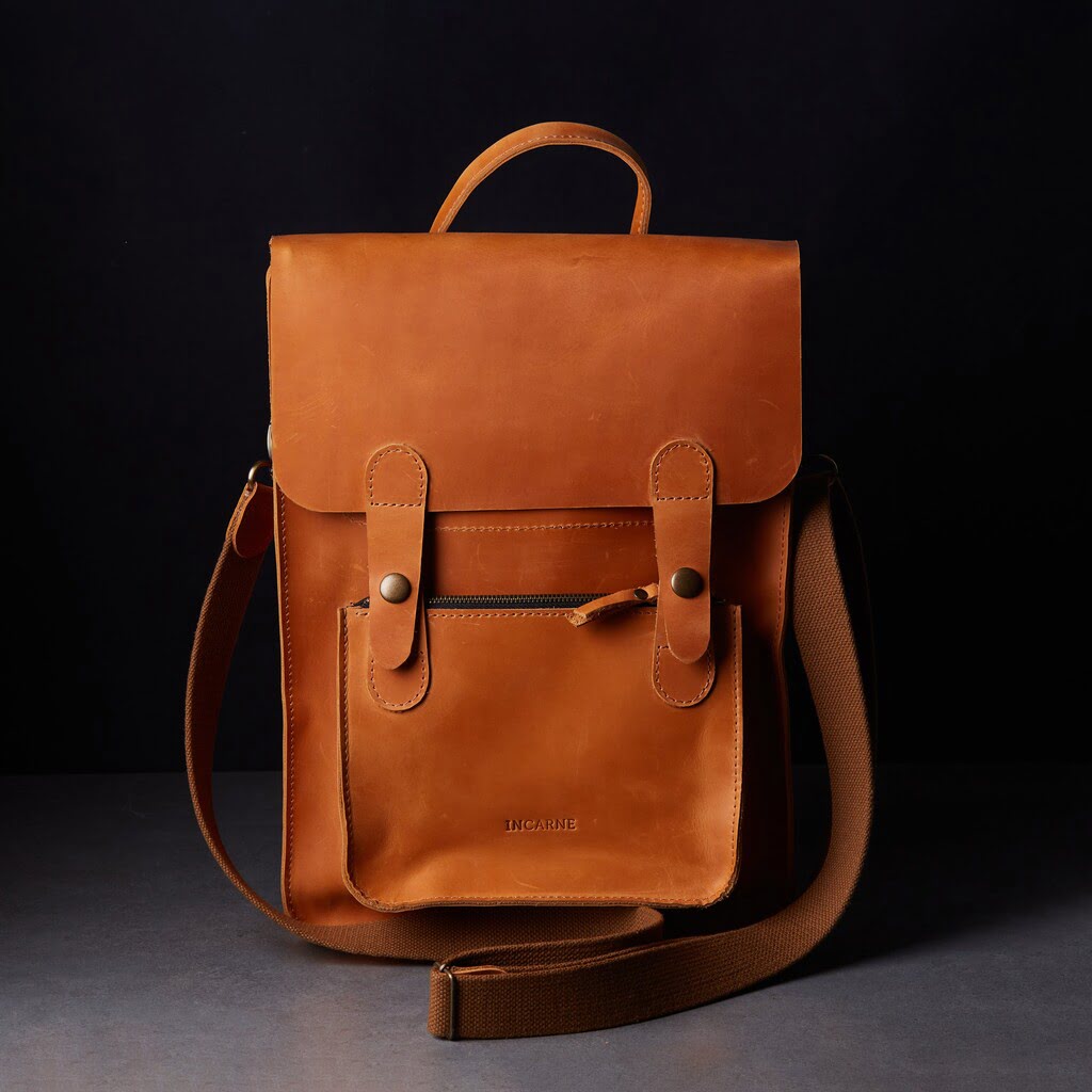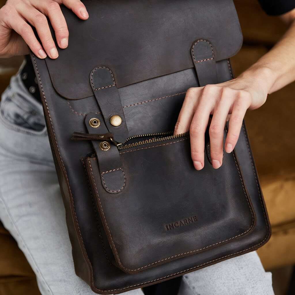 Brit is a convertible backpack briefcase: you can carry it as a cross-body bag or a rucksack. The bag is closed with a zipper, and the top opens with metal buttons that have two different positions.