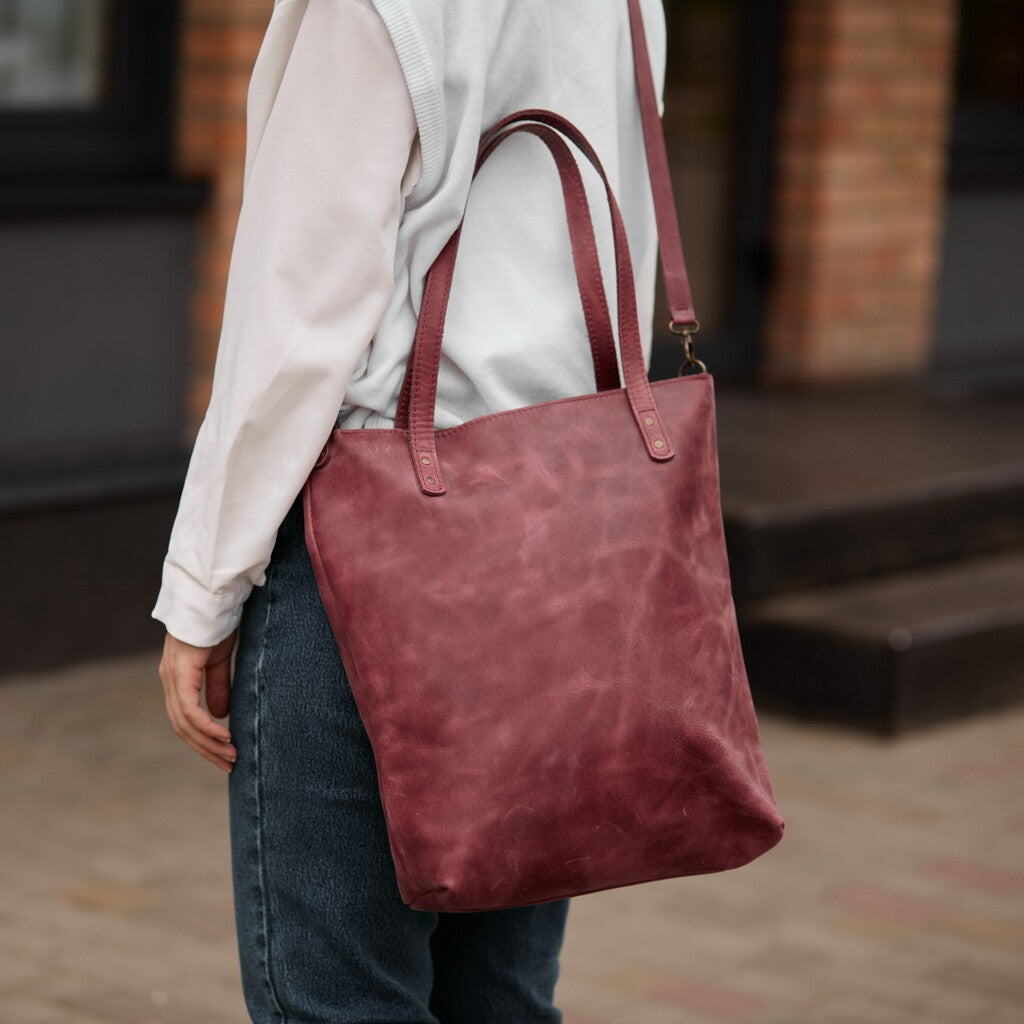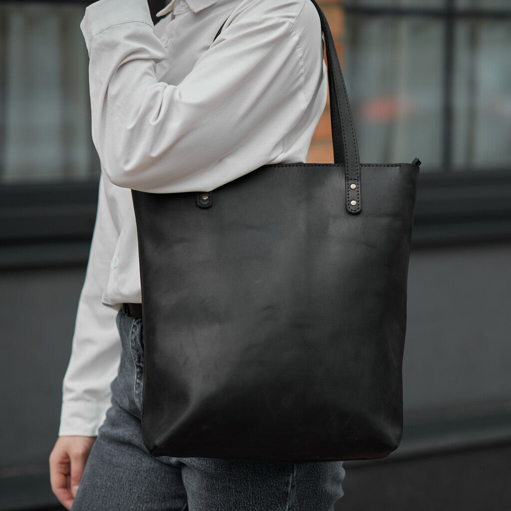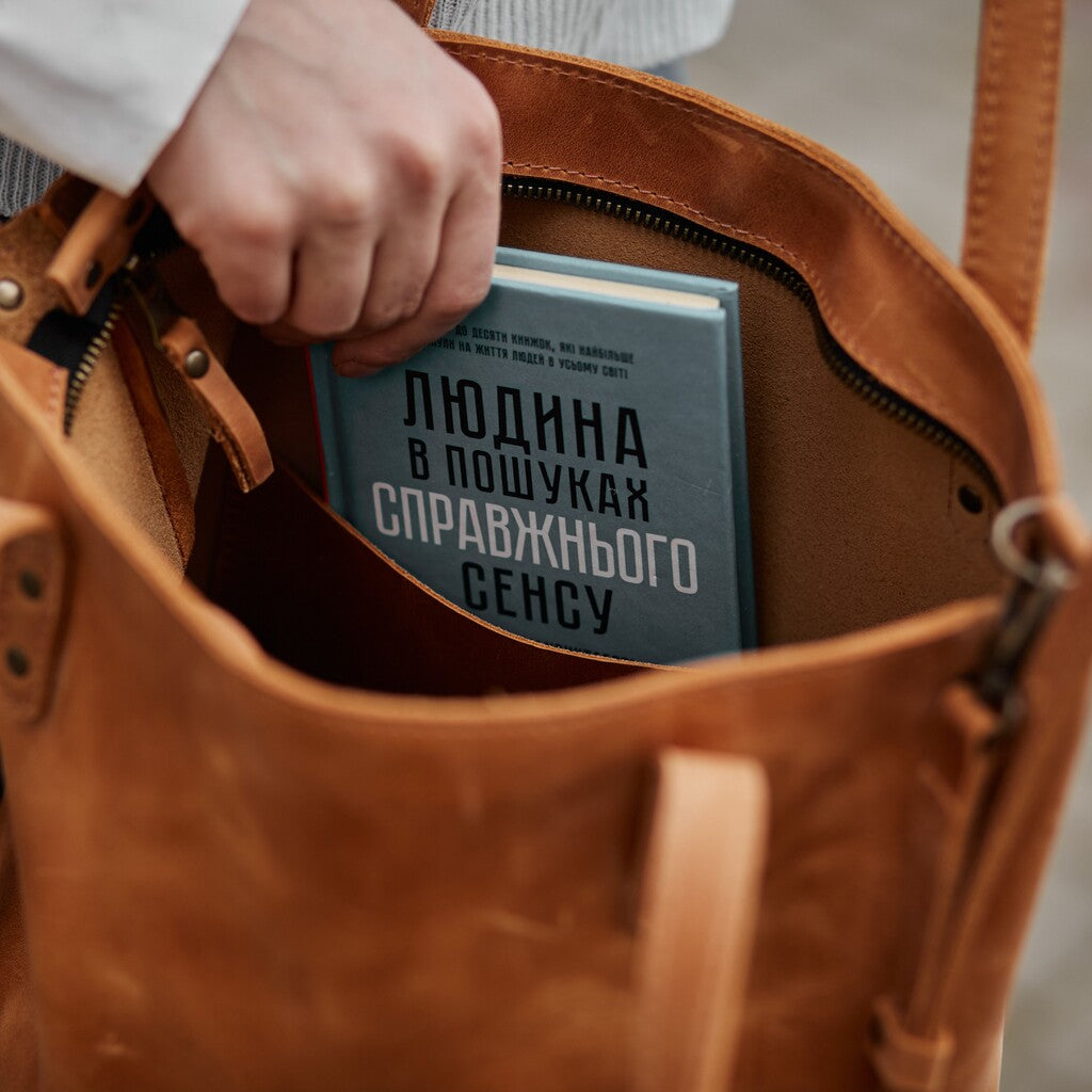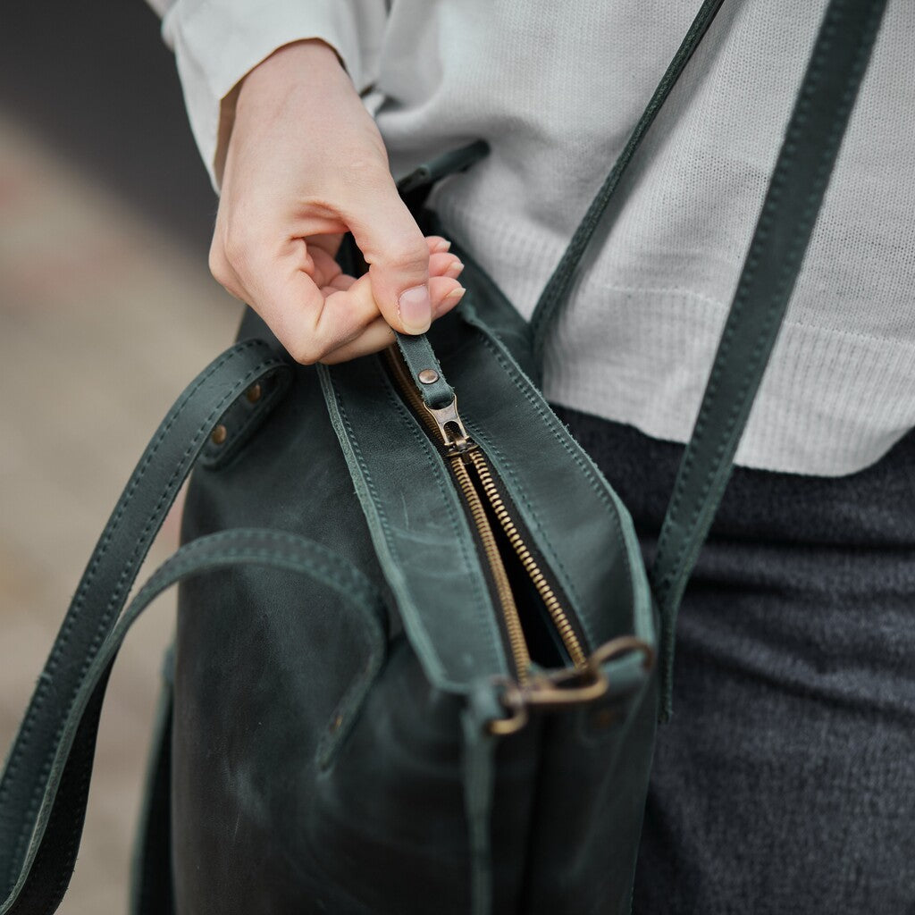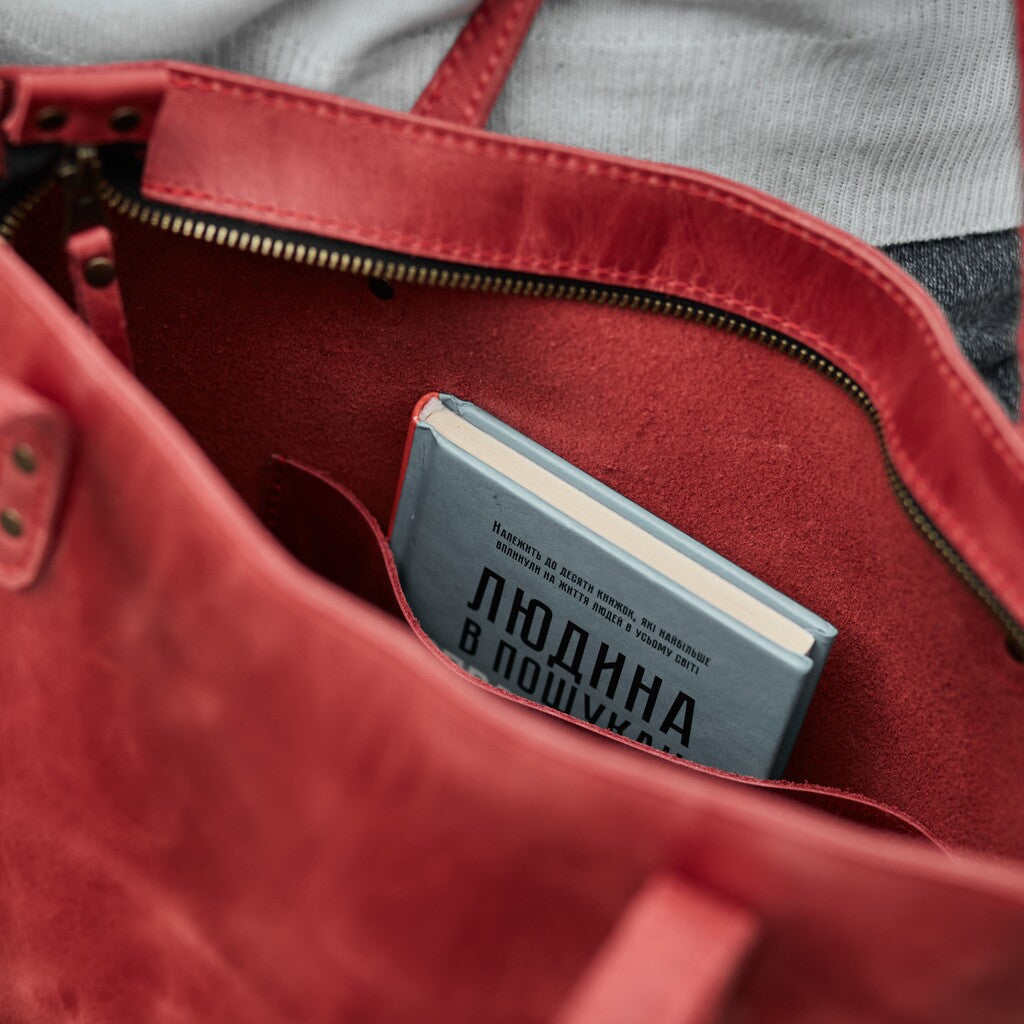 This woman's bag has a simple and stylish design. The main compartment secures with a zipper. It is made of genuine leather, which provides high durability. This 2-in-1 shopper bag is perfect for walking, traveling, or going to the store. It is secured with a high-quality and reliable metal zipper. There is a small pocket on the back wall. The bag is without a lining.