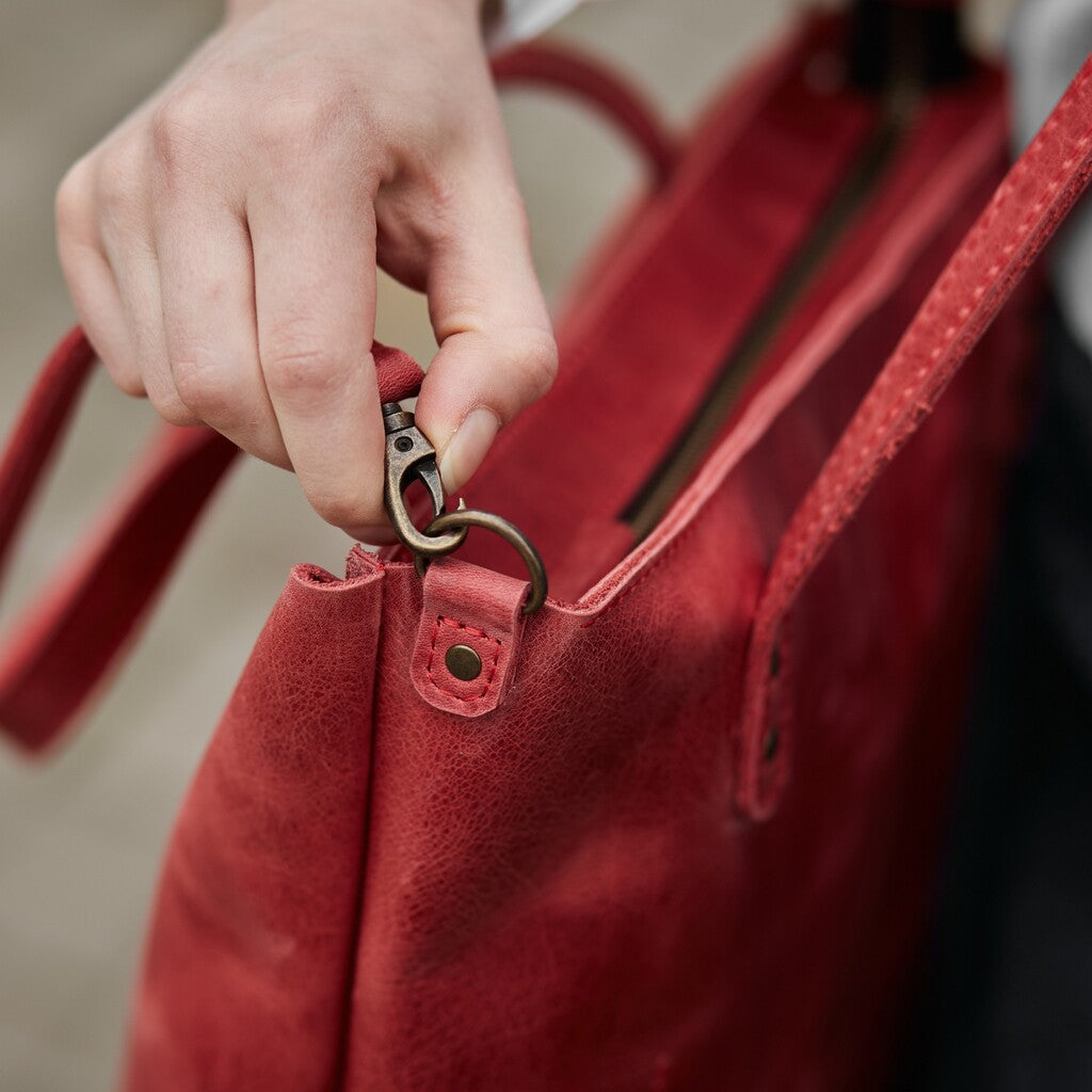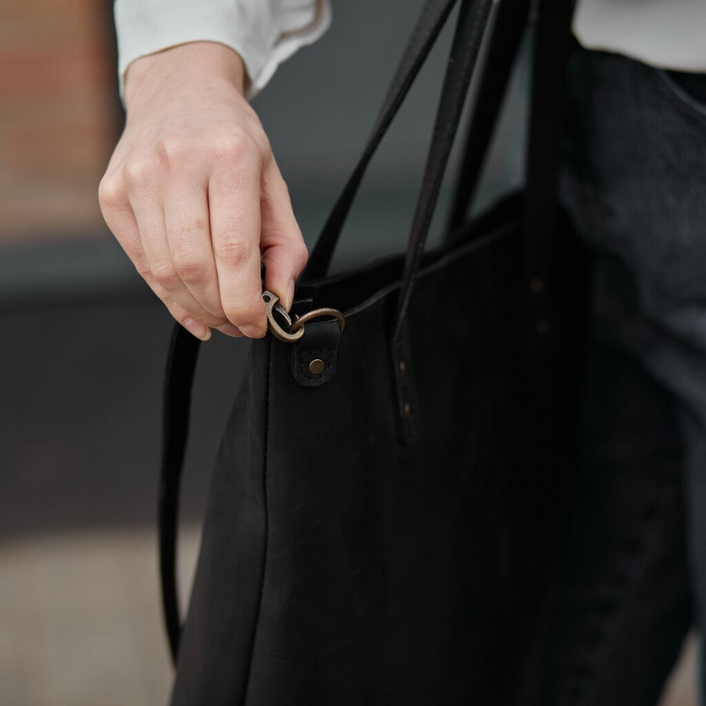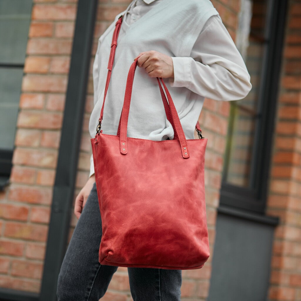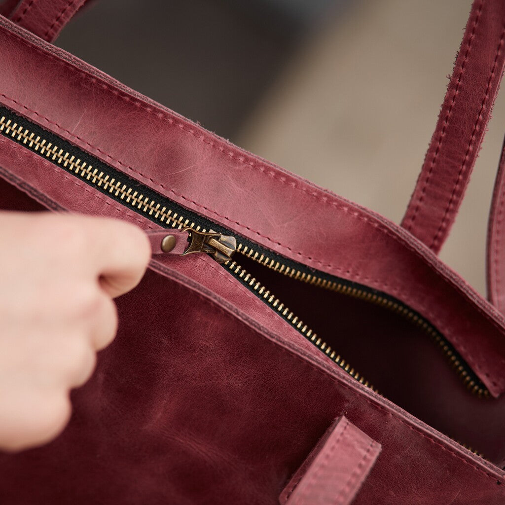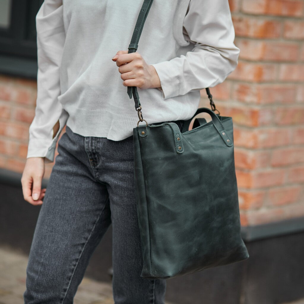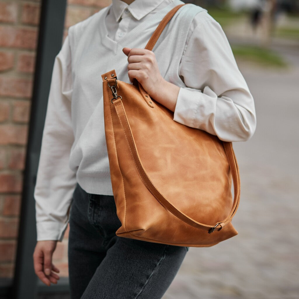 This woman's bag has a simple and stylish design. The main compartment secures with a zipper. It is made of genuine leather, which provides high durability. This 2-in-1 shopper bag is perfect for walking, traveling, or going to the store. It is secured with a high-quality and reliable metal zipper. There is a small pocket on the back wall. The bag is without a lining.