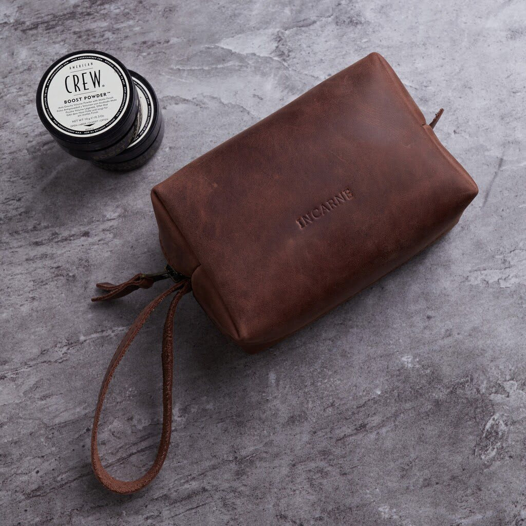 A perfect cosmetic bag for everyday use and travelling. Handcrafted from unlined genuine leather. Completed with the well-made metal zipper, handle and the INCARNE™ embossed logo.